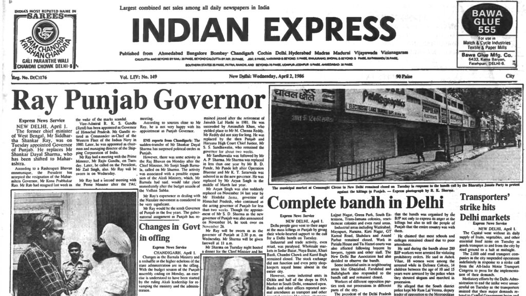 The former CM of West Bengal, Siddhartha Shankar Ray, has been appointed governor of Punjab. He replaces Shankar Dayal Sharma, now moved to Maharashtra.