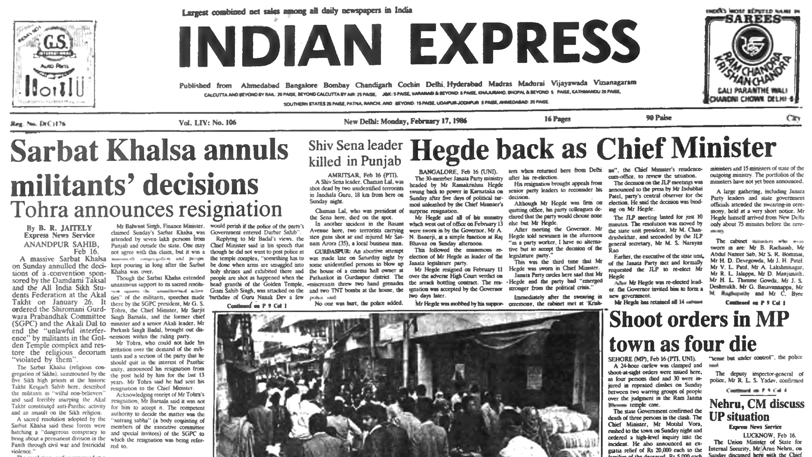 The 30-member Janata Party ministry headed by Ramakrishna Hegde swung back to power in Karnataka after five days of political turmoil unleashed by the Chief Minister’s surprise resignation. Hegde and all of his ministry, which went out of office on February 13, were sworn in by the Governor, A N Banerji at a simple function ar Raj Bhavan. This followed the unanimous re-election of Hegde as leader of the Janata legislature party.