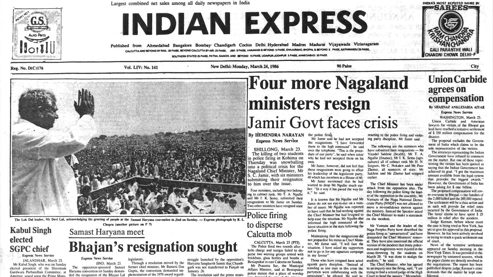 The opposition-sponsored Samast Haryana convention demanded the resignation of the Bhajan Lal government by April 23 for having failed to safeguard the interests of the state and urged the Centre to abrogate sections 7 and 9 of the Punjab Accord relating to territorial and river water dispute. In case the Bhajan Lal government does not resign, the convention demanded the Centre to dismiss the “anti-people” government, dissolve the Assembly and announce mid-term polls.