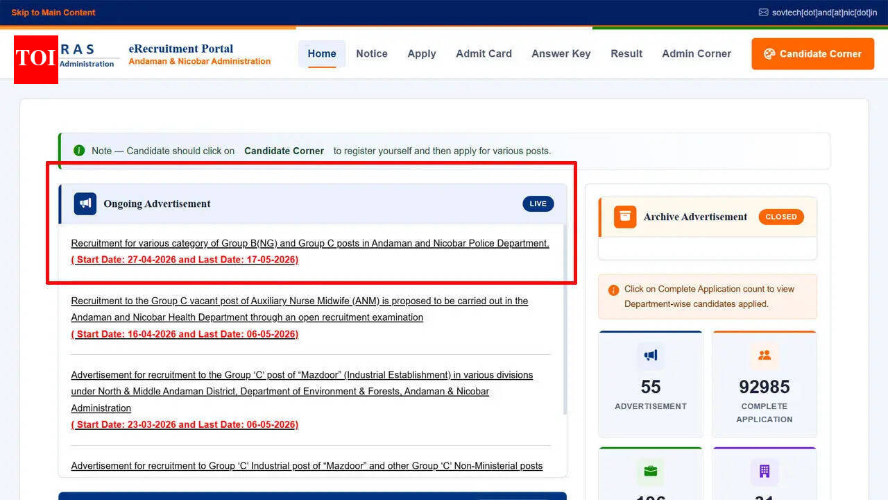 Andaman and Nicobar Police recruitment 2026: The Andaman & Nicobar Police has commenced the application process for its Recruitment 2026 drive, offering 495 vacancies across Group B (Non-Gazetted) and Group C posts. The notification was issued on April 25, 2026, with the online application window opening today and continuing until May 17, 2026.The recruitment covers multiple operational units, including the Executive Branch, Police Radio, Motor Transport, Marine Force, Fire & Emergency Services, and India Reserve Battalion. Candidates are required to apply through the official online portal, with no offline mode available.Recruitment structure and selection stagesThe selection process will be conducted in several stages, beginning with the Physical Measurement and Endurance Test (PM&ET), followed by a written examination. Depending on the post applied for, candidates may also undergo a trade or skill test. Document verification and a medical examination will conclude the process. The PM&ET stage is qualifying in nature and includes standards for height, chest measurement, running, and jumping events. Male candidates are required to complete a 1600-metre race in seven minutes, while female candidates must complete an 800-metre race in five minutes.Application schedule and fee detailsOnline registration started at 11:00 AM today and will close at 11:59 PM on May 17, 2026. The examination date will be notified separately. Application fees are set at Rs 100 for General, OBC, and EWS male candidates. Female candidates, along with those from ST, PwD, and Ex-servicemen categories, are exempted from fee payment. Payment can be made through net banking, UPI, or debit and credit cards.Vacancy distribution and eligibility criteriaThe 495 vacancies are spread across various posts such as Sub-Inspector, Assistant Sub-Inspector, Constable, Fireman, and technical roles. In the Executive Branch, 155 vacancies are available for Constable (Executive), while the Police Radio organisation includes 71 posts for Radio Operator (ASI).Eligibility varies by post, ranging from Class 10 and 12 qualifications to diplomas and graduate degrees in relevant fields such as electronics, communication, and engineering. Certain roles require additional certifications, including driving licences, ITI qualifications, or trade-specific experience.Age limits differ by role. Sub-Inspector and ASI posts have an upper age limit of 30 years, while Constable posts range between 18 and 25 years for men and up to 30 years for women. Relaxations are applicable as per government rules.Application process and instructionsCandidates must complete registration, upload necessary documents, pay the applicable fee, and submit the form online. Authorities have stated that no corrections will be permitted after submission, making accuracy in application details essential.