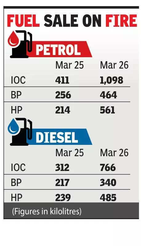 Lucknow: Fuel consumption in Lucknow witnessed a dramatic surge on Thursday when rumours led to queues at the pumps, with petrol sales jumping by over 140% and that of diesel by more than 100%.According to consolidated figures from three govt oil companies — Indian Oil Corporation Limited, Bharat Petroleum Corporation Limited, and Hindustan Petroleum Corporation Limited — total petrol sales increased from 881 kilolitres (KL) on Wednesday to 2,123 KL on Thursday, a steep rise of 141%.Similarly, diesel sales climbed from 768 KL on Wednesday to 1,591 KL on Thursday, a jump of 107% in 24 hours.District supply officer, Lucknow, VP Singh, said the spike in demand was largely driven by bulk purchases by consumers amid rumours regarding fuel availability. He reiterated there is no shortage of petrol or diesel at 290 outlets in Lucknow district, adding that supply lines remain stable.The administration has appealed to the public to avoid panic buying and warned that such behaviour could lead to unnecessary pressure on supply systems and create artificial scarcity.“Monitoring of fuel stations has been intensified to ensure smooth and regulated distribution. All SHOs are on alert. PAC jawans and cops have been deployed at some retail outlets in the city to maintain,” said JCP, law and order, Babloo Kumar.Chief warden, civil defence, Amarnath Mishra, told TOI that civil defence volunteers were deployed at petrol pumps on Friday where they assisted in crowd management and ensuring orderly fuel distribution.Some residents claimed that fuel rationing was done at several petrol pumps amid the sudden surge in demand.Mohammed Bilal, a resident of Dewa Road, said he was allowed petrol worth only Rs 2,000 in his car, and when he requested more, the pump staff refused, citing instructions to limit supply. Akash Sharma, a two-wheeler rider from Rajendra Nagar, said he was given petrol worth just Rs 200 despite needing more for daily commuting.