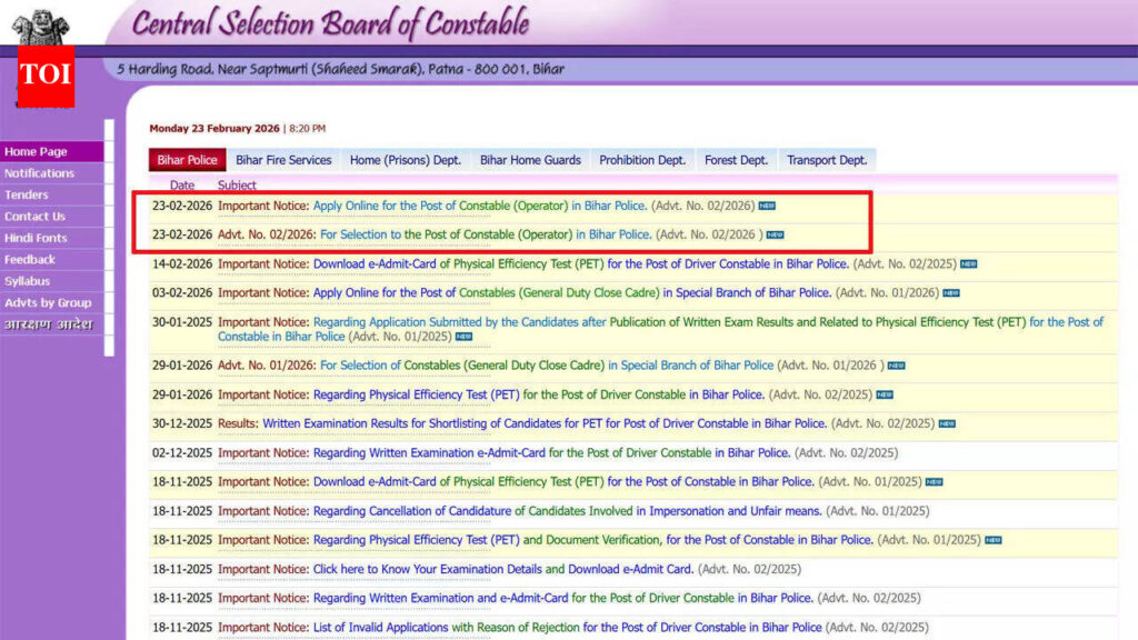 Bihar Police Constable Operator recruitment notification 2026: The Central Selection Board of Constables (CSBC) has issued the Bihar Police Constable (Operator) Notification 2026 for recruitment in the Bihar Police Radio (Technical) Cadre. A total of 993 vacancies have been announced under Advertisement No. 02/2026. The notification was released on February 23, 2026, and the recruitment process will be conducted through an online application system.Eligible candidates will be able to submit their applications through the official website, CSBC Bihar Official Website. The online registration window will remain open from March 1, 2026 to March 31, 2026. The recruitment drive includes details on eligibility, category-wise vacancies, selection stages, examination pattern, physical standards, and salary structure.Bihar Police Constable Operator recruitment notification 2026: Important dates