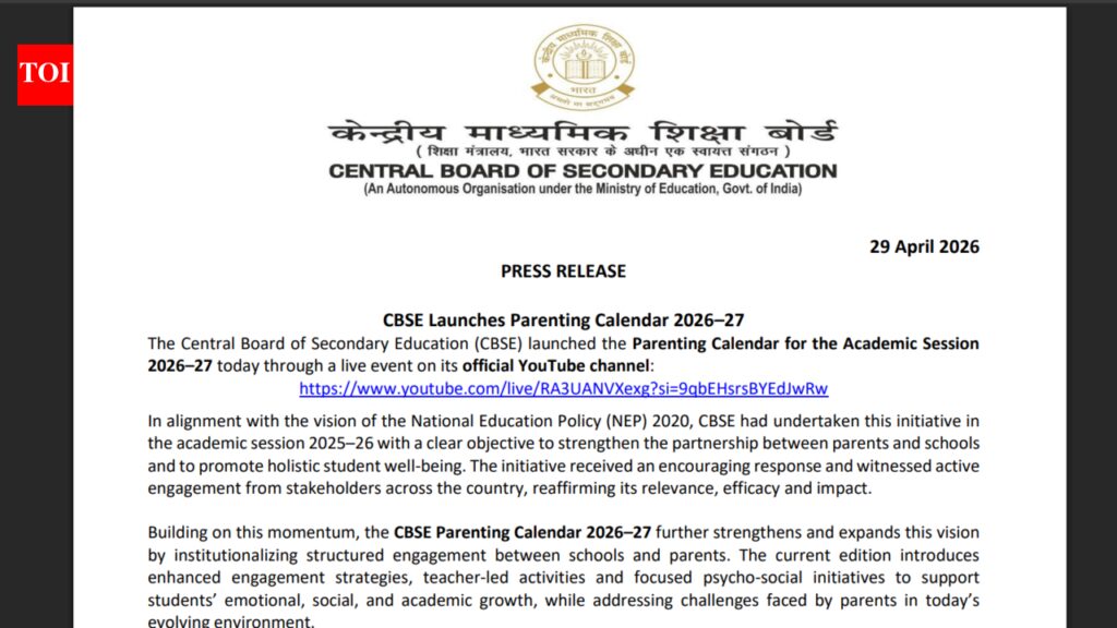 This year’s Parenting Calendar for 2026–27 has been framed for promoting collaboration between schools and parents for better engagement of students in different walks of life, with greater parental involvement.The board has also emphasised that the initiative is intended to help families navigate academic pressures and changing educational expectations while ensuring students receive balanced support at home and in school.