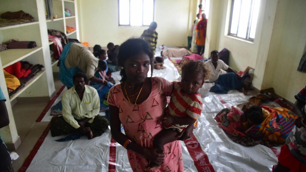 Villagers of Suryalanka who were relocated to a cyclone shelter in Bapatla district on Tuesday after their huts were damaged in heavy rains.