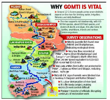 Lucknow: Gomti, the lifeline for 1.5 crore people and home to more than 200 species of flora and fauna, is slowly drying up due to multiple reasons, mostly caused by human activity and some natural factors, reveals a recent field survey by a team from Babasaheb Bhimrao Ambedkar University (BBAU).The survey covered the river’s origination point in Pilibhit and districts like Shahjahanpur, Lakhimpur Kheri, Sitapur and Hardoi through which it flows.In Pilibhit, about 15 km near the origin was found to be dry due to very low water at the source (Fulhar Jheel) and disruption of natural flow. The river’s flow was also slow across Pilibhit, Shahjahanpur, Lakhimpur Kheri and Sitapur.The river was found to be shallow and narrow at several stretches, leading to the spread of invasive plants like water hyacinth. Congress grass was also found in abundance along some banks, restricting natural vegetation growth.These conditions were seen at multiple locations, including near Fulhar Jheel (Madhotanda, Pilibhit), Triveni Ghat (Ghatampur), Panna Ghat (Shahjahanpur), Imliya Ghat (Lakhimpur Kheri) and stretches across Sitapur and Hardoi, where reduced flow and degraded banks have allowed invasive species to spread.Across these areas, clearing of natural vegetation, unprotected wetlands and encroachment through farming and construction along both banks were recorded, further weakening the river system.The survey also found that several tributaries of the Gomti are under stress. The Katna stream in Piparia Bhaja (Pilibhit) has become seasonal and remains almost dry or stagnant during non-monsoon months, while the Bhainsi river in Shahjahanpur often dries up in summer.The Kathina river near Sukatiya (Pilibhit-Lakhimpur Kheri stretch) shows reduced depth and slow flow due to encroachment and sand mining. Similarly, the Behta river in Hardoi has weakened flow due to land levelling for farming, indicating that many tributaries either carry very little water or face periodic drying.The survey further revealed that excessive groundwater abstractions near the river has caused irreversible damage to the baseflows resulting in loss of water in the river. There is a possibility of augmentation particularly at the Sharda canal bifurcation point in Puranpur (Madhotanda, Pilibhit) and through the Devipur minor near Fulhar Jheel. However, this water is not adequately returned during low-flow periods, reducing flow in downstream stretches across Lakhimpur Kheri, Sitapur and Hardoi.Pollution levels were found to be high at several locations along the Gomti. At Triveni Ghat (Ghatampur, Pilibhit) and Panna Ghat (Shahjahanpur), the river is polluted due to ritual waste, flowers, cloth and plastic dumping linked to religious activities.At Imliya Ghat (Lakhimpur Kheri), picnic and recreational waste, especially thermocol plates and single-use plastics, was observed along the banks.In Sitapur, the Sarayan river near Hargaon — a major tributary — is polluted by untreated wastewater from nearly 40 drains and discharge from a sugar mill, along with agricultural runoff, leading to algal growth.In Hardoi, the Sai river at Bhajehata showed faecal contamination due to open defecation.Across multiple stretches in Pilibhit, Shahjahanpur, Lakhimpur Kheri, Sitapur and Hardoi, domestic waste and plastic litter were also found along the riverbanks, largely due to poor waste management and low water flow, which reduces the river’s natural ability to clean itself.“Human behaviour, lack of coordination between authorities, and administrative negligence have all contributed to the present condition of the Gomti,” said Prof Venkatesh Dutta, head of the department of environmental science, who led the survey.He said the river can still be revived by ensuring minimum flow at the source at Fulhar Jheel. Researchers Rakesh Singh Kushwaha and Ankit Kumar added that at least 20 cusecs of water should be supplied from the Sharda canal system to sustain downstream flow.The team stressed protecting wetlands and natural drainage channels, removing encroachments and safeguarding riverbanks to support recovery. Prof Dutta said that low-cost, nature-based solutions can improve flow.“The condition of the Gomti is reversible, but only if timely and coordinated action is taken,” said researchers Komal Loshali, Pragati Sharma and Ayusma Yadav.