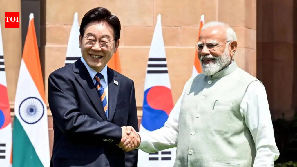 NEW DELHI: Prime Minister Narendra Modi on Monday India-South Korea ties as New Delhi and Seoul signed several MoUs aimed at deepening bilateral cooperation.During a joint press statement, PM Modi said Korean President Lee Jae Myung visit is a crucial step towards a more advanced bilateral framework. “I am delighted to welcome President Lee on his first visit to India. President Lee’s life is an inspiring example of struggle, service, and dedication. Every challenge has only strengthened his resolve to serve the people. Although this is his first visit to India, his affinity for India has been evident since our very first meeting,” PM Modi said.“This visit of the President of Korea to India is extremely important. Democratic values, market economy, and respect for the rule of law are in the DNA of both our countries. We also have a common outlook in the Indo-Pacific region,” he added.The Prime Minister also said that partnership between both the nations is now moving towards a more advanced phase“Based on all this, our relations have become more dynamic and comprehensive over the last decade, and today, with President Lee’s visit, we are going to transform this trusted partnership into a futuristic partnership. We will realise new opportunities for cooperation in every field, from chips to ships, talent to technology, environment to energy, and together ensure the progress and prosperity of both countries,” he said.Meanwhile, South Korean President Lee Jae Myung said that both the countries aim to increase the “current USD 25 billion level of annual trade volume between India and South Korea to around USD 50 billion by 2030.”“In the era of uncertainty, we share our view that India and Korea can be the most ideal partners for comprehensive cooperation to promote mutual growth and innovation. We have also agreed to enhance cooperation in strategic industries, including shipbuilding, AI, finance, and defence and promote culture and people-to-people exchanges,” he added.The two sides also resolved to work together to ensure peace and stability in the Indo-Pacific region.“Following President Lee’s visit, we are going to transform our trusted collaboration into a futuristic partnership,” Modi said.The bilateral trade and economic relations gathered momentum following the implementation of the Comprehensive Economic Partnership Agreement (CEPA) in 2010.“From chips to ships, talent to technology, entertainment to energy, we will realise new opportunities for cooperation in every sector,” he added.The prime minister said both sides will continue to work towards an inclusive Indo-Pacific.“Through our shared efforts, we will continue to contribute to a peaceful, progressive, and inclusive Indo-Pacific,” he said.The talks also focused on enhancing ties in areas of trade, investments, AI, semiconductors, critical and emerging technologies and people-to-people connect.
