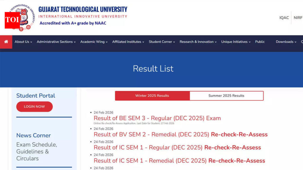 Gujarat Technological University (GTU) has issued fresh result notifications for several undergraduate and postgraduate programmes under the Winter 2025 examination cycle. The latest declarations include regular, remedial and recheck or reassessment outcomes for multiple semesters across engineering, pharmacy and management streams. Students can access their results through the official website at gtu.ac.in using their enrolment or seat number. The results are available in online format, and candidates are advised to download and retain a copy for future reference. Temporary access delays were reported due to heavy traffic on the portal following the announcements.MCA Integrated results released across semestersThe university has declared recheck and reassessment results for Master of Computer Applications (Integrated) Semester 1 under both regular and remedial categories. In addition, reassessment outcomes for Semester 2 (remedial) and Semester 3 (regular and remedial) have also been published.These notifications cover candidates who had applied for re-evaluation after the Winter 2025 examinations. Students can verify their updated marks through the result section on the university portal.BE, Pharmacy and other programme results announcedGTU has also released the result for Bachelor of Engineering Semester 3 under the regular category. Alongside engineering results, the university declared reassessment outcomes for Bachelor of Pharmacy Semester 7 under both regular and remedial categories.In addition, results for Bachelor of Vocational Semester 2 under the remedial recheck and reassessment category have been made available as part of the latest notifications.Direct link to check and download the GTU result 2026How to check the result onlineTo access the scorecard, candidates should visit the official website and navigate to the ‘Exam’ section, followed by the ‘Result List’ option. After selecting the relevant course, students must enter their enrolment or seat number along with the security code.The result will be displayed on the screen, and candidates should download the PDF for record purposes. It is important to verify personal details, subject-wise marks and result status carefully. Any discrepancy should be reported to the university’s examination authority without delay.The online scorecard will serve as the provisional result until official documents are issued by the university.