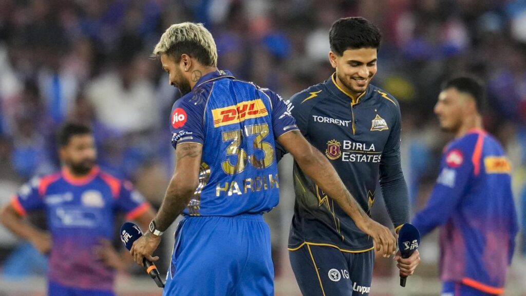 Gujarat Titans’ captain Shubman Gill (right) and Mumbai Indians’ captain Hardik Pandya (left) during the toss ahead of their IPL 2026 T20 cricket match, in Ahmedabad, on April 20, 2026.