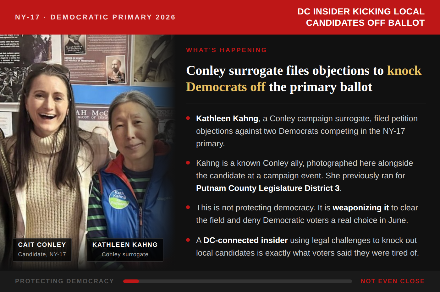 “Kathleen Kahng, a Conley campaign surrogate and former Putnam County legislative candidate, filed objections to the petitions of two Democrats competing in the June primary,” the message read, referencing Army vet Cait Conley, who is running for Lawler’s seat as a Democrat. “Not a concerned voter. A Conley insider. This isn’t democracy. It’s field-clearing.”