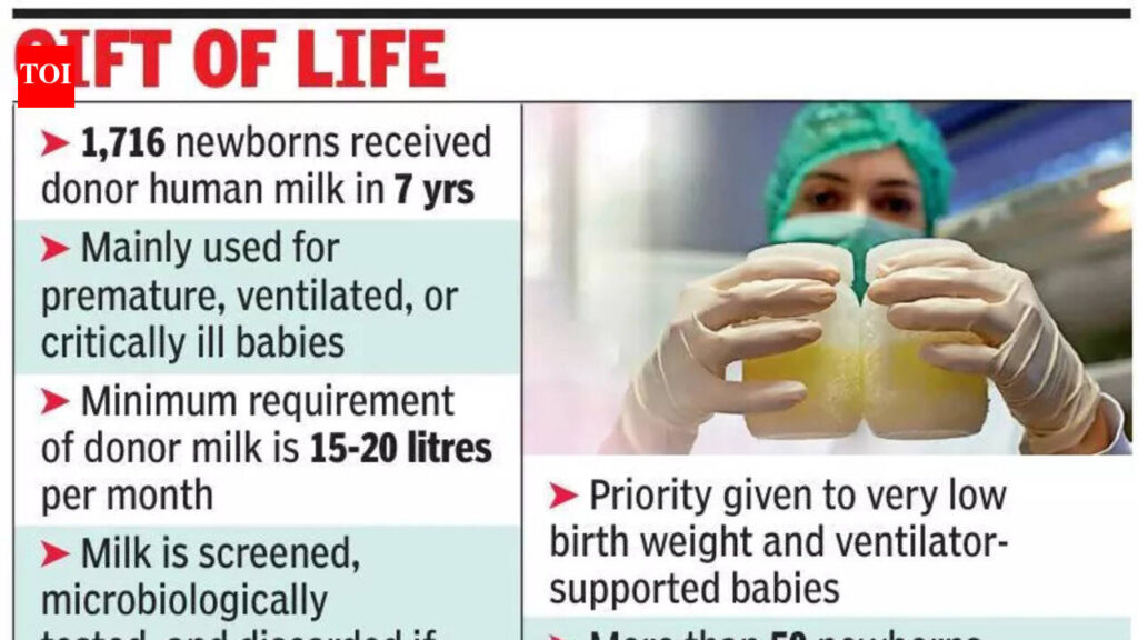Lucknow: A baby boy weighing just 1.2 kg (normal weight 2.5-4 kg) was born with underdeveloped lungs. He was admitted to the neonatal intensive care unit at KGMU and needed a ventilator to breathe.His mother had a complicated delivery and could not produce milk in the first few days. The baby was also too weak to digest formula milk. Doctors fed him donor human milk (DHM) from the university’s milk bank during those critical days. They say such cases are common.As the milk bank completed seven years on Mar 5, TOI traced its journey at KGMU. In this period, more than 1,700 vulnerable newborns received donor milk at the hospital. Doctors say demand continues to exceed supply, meaning some babies still have to wait.The milk bank was established in 2019 under the guidance of paediatrician Prof Mala Kumar. It provides donor milk for babies whose mothers cannot breastfeed immediately after delivery.“These babies are often extremely premature or critically ill,” said Prof Shalini Tripathi, in charge of the milk bank. “Donor human milk is much easier for them to digest than formula feed. We rarely see vomiting or feeding intolerance in babies who receive it.”Before the milk reaches a newborn, it passes through several safety checks. Donor mothers are first medically screened. The milk is then tested in the laboratory under the supervision of microbiologist Prof Sheetal Verma.“If any bacterial growth is detected during testing, the milk is discarded,” Prof Verma said. “For such fragile babies, ensuring zero contamination is extremely important.”Doctors say counselling mothers plays a key role in encouraging donations. “Conversations among mothers in the wards often encourage others to donate,” Prof Tripathi said. “When one mother comes forward, it motivates others as well.”Each year, more than 50 newborns whose mothers died or were unable to feed them depend entirely on donor milk. In some cases, mothers admitted in hospitals outside the city are counselled over the phone to express and store milk for their babies.Head of paediatrics, Prof SN Singh said donor milk became an important part of neonatal care at the hospital. “For very low birth weight babies and those on ventilator support, donor human milk can significantly improve survival and reduce complications,” he said.The neonatal units at KGMU require around 15-20 lt of donor milk every month, but supply is often lower.Manager of the bank, Dr Anshika Rastogi said strict donor screening criteria and hesitation among mothers reduce the number of eligible donors. Because of the shortage, the milk bank prioritises the sickest babies.Doctors say greater awareness about milk donation could help close the gap and ensure more newborns receive the support.