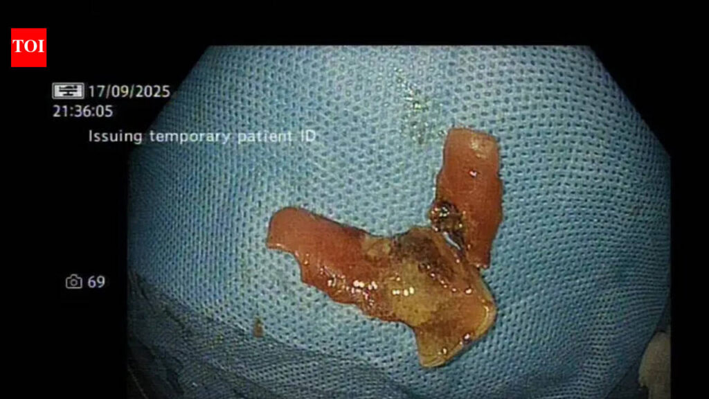 NEW DELHI: A routine meal turned into a medical emergency when a man accidentally swallowed his denture—only for it to get lodged deep inside his food pipe, leaving him in severe distress. In a complex, high-risk procedure, doctors at a private hospital used a laser-assisted endoscopic technique to remove it, avoiding the need for major surgery.The patient, a 45-year-old vegetable seller from Rampur near Moradabad, arrived gasping, with intense throat pain and difficulty swallowing. Scans revealed the dental plate stuck at the cricopharynx—an extremely sensitive junction between the food pipe and windpipe—where its sharp metallic clasps risked tearing the esophagus. This narrow, rigid area is a common site where foreign bodies get impacted.“This was one of the most difficult foreign bodies we have encountered,” said Dr Anil Arora, Chairman, Institute of Liver, Gastroenterology and Pancreaticobiliary Sciences, Sir Ganga Ram Hospital. “Conventional tools like forceps or snares could have caused serious injury.”Foreign bodies — such as coins, dentures, button batteries, pins or even fish and meat bones — are not digested and may not pass naturally. Sharp objects can injure or perforate the gastrointestinal tract, while some may slip into the windpipe, causing breathing problems or serious lung infections.The patient was unable to swallow or expel the object. Endoscopy confirmed the denture was firmly lodged, and standard removal methods were deemed unsafe due to the risk of injury.After initial attempts failed, the team switched strategy. Using a precision laser under endoscopic guidance, doctors broke the denture into smaller fragments inside the esophagus. A protective over tube was then deployed to shield the inner lining as each piece was removed in a controlled manner.“The laser allowed controlled fragmentation, while the over tube prevented damage from sharp edges,” said Shrihari Anikhindi, consultant gastroenterologist. “This helped us avoid open surgery, which carries significant risks and longer recovery.”The laser used relies on a focused, high-energy beam — often using a holmium source — allowing precise fragmentation without damaging surrounding tissue. This approach helped avoid complications such as airway obstruction or perforation, which can lead to deep neck infections.Doctors say commonly seen foreign bodies include fish or chicken bones, dentures and even broken toothbrush parts, and stress that early medical attention is critical.The patient recovered without complications—turning what could have been a life-threatening situation into a showcase of minimally invasive innovation, said doctors. EOM