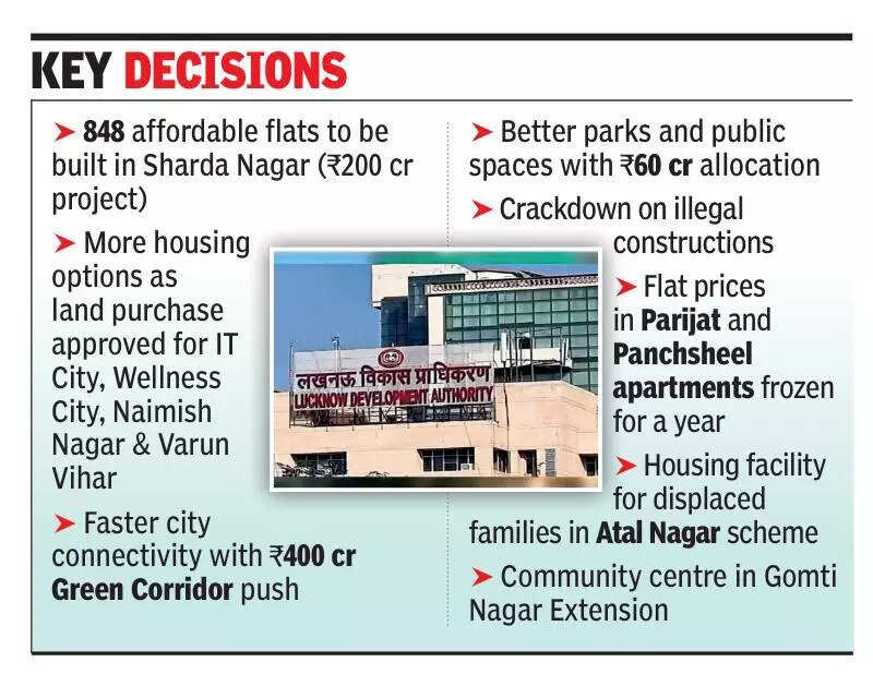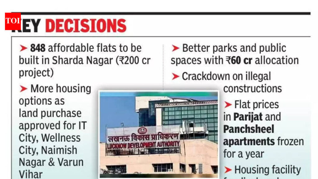 Lucknow: The Lucknow Development Authority (LDA) has approved a budget of Rs 5,148 crore for 2026-27 that will mainly focus on affordable housing, new townships and boost basic infrastructure.The decision was taken at the authority’s 187th board meeting on Friday, chaired by divisional commissioner Vijay Vishwas Pant. As part of the plan, Rs 200 crore has been set aside to build 848 flats in Sharda Nagar Extension. The project will include four 12-storey towers, with one-and two-bedroom units, along with facilities such as water supply, electricity, parking, lifts, parks and a play area. Officials said the move follows directions from chief minister Yogi Adityanath to expand affordable housing. LDA vice-chairperson Prathmesh Kumar said the budget prioritises housing and infrastructure, including land acquisition, ongoing schemes and completion of projects. The authority has approved Rs 1,600 crore for land acquisition in areas such as IT City, Wellness City, Naimish Nagar and Varun Vihar. Another Rs 1,298 crore will be spent on developing and maintaining housing schemes while Rs 200 crore has been allocated for infrastructure. The Green Corridor project will receive Rs 400 crore and Rs 60 crore has been set aside for parks and their upkeep. Funds have also been earmarked under Pradhan Mantri Awas Yojana 2.0. The board also approved measures to act against illegal construction, with Rs 2 crore allocated for machinery. In Gomti Nagar Extension, land near Saraswati Apartment will be converted into a community centre. The width of a proposed road in Sector-6 has been reduced, with surplus land to be used for housing and commercial purposes. Flat prices in Parijat and Panchsheel apartments will remain unchanged for one year. The board approved new building by-laws for certain properties and cleared layout changes in several schemes, including CG City, Aishbagh and Rifah-e-Aam. Families affected by the Anant Nagar housing scheme will be offered alternative housing in Atal Nagar, subject to eligibility. Other approvals include permissions related to a hi-tech township project and revisions to map approval fees, along with the implementation of the Uttar Pradesh Urban Redevelopment Policy 2026. Map approval fees up by 3% LDA has increased map approval fees by 3% which will come into effect on April 1. According to LDA officials, a hike was proposed in view of the rising cost index. The increase will directly impact individuals and builders seeking approval for residential and commercial construction. Key components such as development charges, inspection and permission fees are set to be revised upwards.