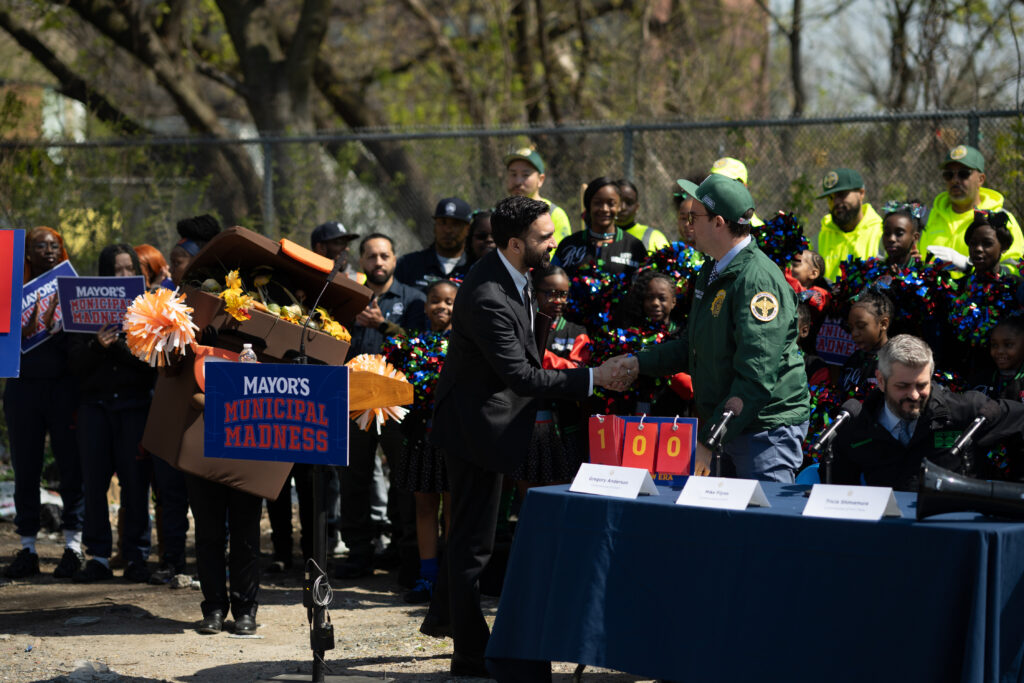 He started the day in Queens at a graduation ceremony for Department of Correction recruits, hopped over to the Bronx to celebrate trash cleanup efforts with a youth cheerleading squad and a garbage-can mascot, and then scooted to Harlem to perform home lead inspections.