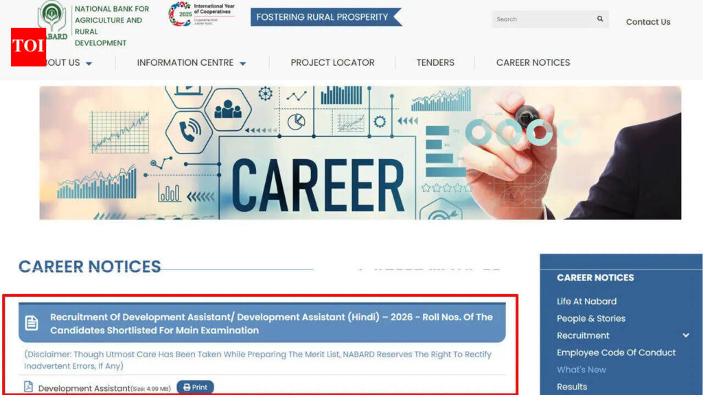 NABARD DA prelims result 2026: The National Bank for Agriculture and Rural Development has released the NABARD Development Assistant Result 2026 on its official website. Candidates who appeared for the preliminary examination can now check their qualifying status through the merit list PDF available online.The preliminary examination for Development Assistant and Development Assistant (Hindi) posts was conducted on February 21, 2026. The result, declared on March 30, 2026, contains roll numbers of candidates shortlisted for the next stage of the recruitment process.Result released in merit list formatThe result has been published in the form of a merit list PDF, listing roll numbers of shortlisted candidates across various regional offices, including Andhra Pradesh, Assam, and Bihar. Candidates are required to download the file and search for their roll numbers to confirm qualification.A total of 162 vacancies are being filled through this recruitment drive. The selection process includes two stages: prelims and mains. Only candidates whose roll numbers appear in the merit list are eligible to proceed to the mains examination.Steps to check prelims result onlineCandidates can access the result by visiting the official website and navigating to the careers section. The merit list link for the Development Assistant Recruitment 2026 leads to the PDF file. After opening the document, candidates can use the search function to locate their roll numbers.No login credentials are required to access the result, as the list is publicly available. Candidates are advised to carefully verify all details mentioned in the document.• Direct link to check and download the NABARD DA prelims result 2026 | Link 2Details mentioned in merit list PDFThe merit list includes key information such as the name of the organisation, exam stage, and date of examination. It also provides region-wise roll numbers of shortlisted candidates and instructions related to the mains examination.The document does not include individual scores or marks. It serves only as a qualifying list for the next stage.Mains examination scheduled in AprilCandidates who have qualified in the prelims will appear for the mains examination scheduled on April 12, 2026. Admit cards for the mains stage are expected to be issued in April, approximately a week before the examination.The prelims stage is qualifying in nature, and final selection will be based solely on performance in the mains examination.