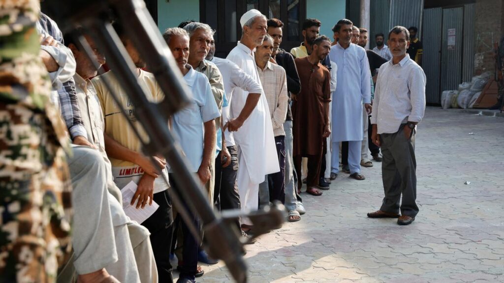 People queue up to vote at a polling station in Srinagar on .
