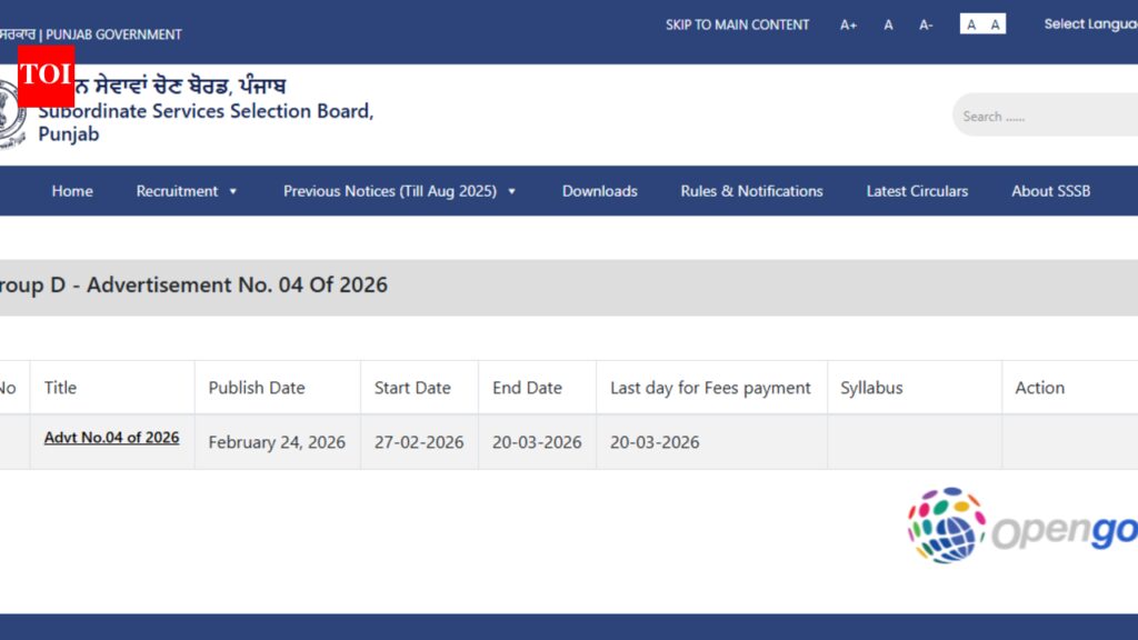 The Punjab Subordinate Services Selection Board (PSSSB) has released a new notification for Group D recruitment under Advertisement No. 04/2026. The board will fill multiple vacancies across different Punjab government departments. Interested and eligible candidates can apply online through the official website, sssb.punjab.gov.in. The application process will begin on February 27, 2026, and candidates must complete the registration and fee payment before the last date, March 20, 2026. Applicants must have passed Class 10 and studied Punjabi at the matriculation level. The recruitment will be conducted through a written examination followed by document verification. Candidates are advised to read the detailed notification carefully before applying.