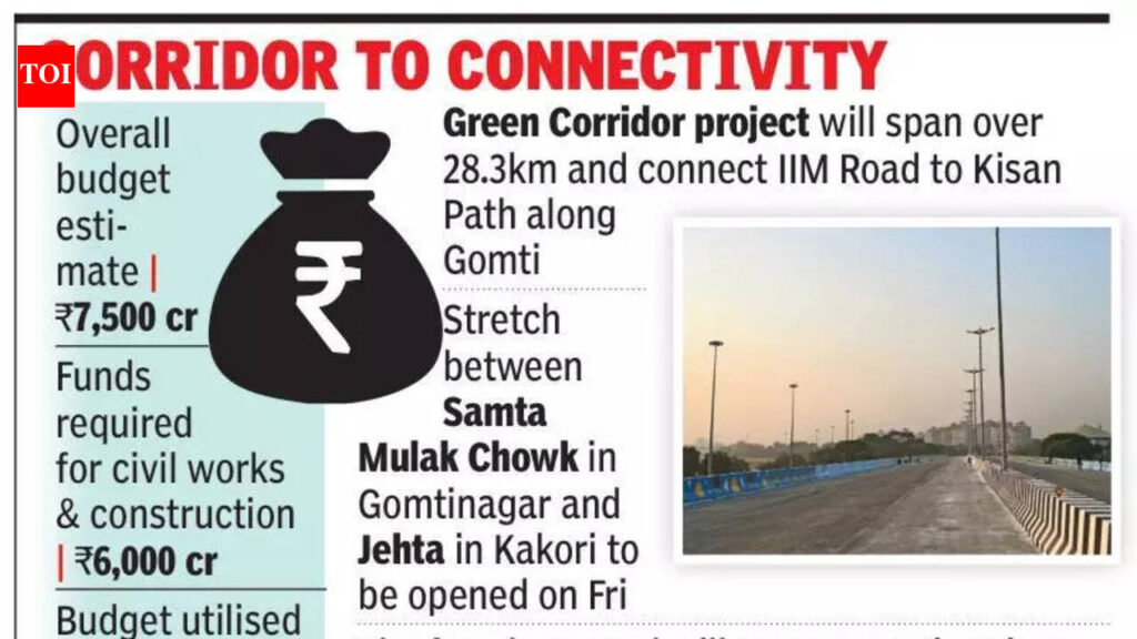 Lucknow: Commuting between the western end and eastern side of the city will get smoother within a week as the second portion of the Green Corridor project is set to be inaugurated on March 13.Lucknow MP and defence minister Rajnath Singh, along with chief minister Yogi Adityanath, will open the new carriageway.Spanning over almost 5.1km, the stretch that will be inaugurated spans from Bhikhampur to Daliganj.Once open for vehicular movement, motorists will have an easier ride between Samta Mulak crossing in Gomtinagar and Jehta locality in Kakori.The four-lane road will bring down the travel time between the two ends by at least 15-20 minutes.However, commuters may have to face some bottlenecks as vehicles plying via the carriageway of Green Corridor will merge with the existing traffic and create conflicts at Nishatganj and Bikhampur until traffic-calming solutions are put in place. Upon completion, the overall Green Corridor project will facilitate seamless traffic movement between Jehta, a village situated near the IIM Road, and Faizabad Road on the other end at Chinhat. Lucknow Development Authority (LDA) vice-chairman Prathmesh Kumar said the second portion would ease existing traffic congestion in Daliganj, Hazratganj and Nishatganj.“Our team has already started work on the next phase with setting up of an embankment along the Gomti between Shaheed Path and Pipara Ghat,” he said.A senior officer at the LDA said that the entire project would span over 28.3km and connect IIM Road to Kisan Path along the Gomti. “Through Kisan Path, one will be able to reach Faizabad Road by covering an additional distance of about 7km,” he said.