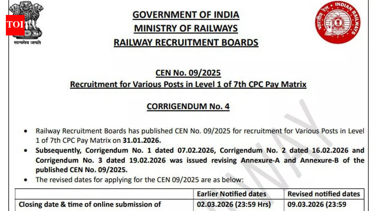The Railway Recruitment Boards under the Government of India’s Ministry of Railways have extended the closing date for submission of online applications under CEN No. 09/2025 for recruitment to various posts in Level 1 of the 7th CPC Pay Matrix.The recruitment drive covers 22,195 vacancies under the Group D category. The revised schedule was issued through Corrigendum No. 4, following earlier corrigenda that amended Annexure-A and Annexure-B of the original notification published on January 31, 2026.Revised application and fee payment schedule announcedAs per the latest notice, the closing date and time for online submission of applications has been extended to March 9, 2026 (23:59 hrs). Earlier, the deadline was March 2, 2026 (23:59 hrs).The last date for payment of the application fee for submitted applications has been revised to March 11, 2026 (23:59 hrs), in place of the earlier March 4, 2026 (23:59 hrs).The modification window for corrections in the application form, along with payment of the prescribed modification fee, will now remain open from March 12, 2026 to March 21, 2026 (23:59 hrs). Previously, this facility was scheduled from March 5, 2026 to March 14, 2026 (23:59 hrs). Details entered in the ‘Create an Account’ form and the chosen Railway cannot be altered.Eligible scribe candidates must submit their scribe details on the application portal between March 22, 2026 and March 26, 2026. The earlier notified dates for this process were March 15, 2026 to March 19, 2026.