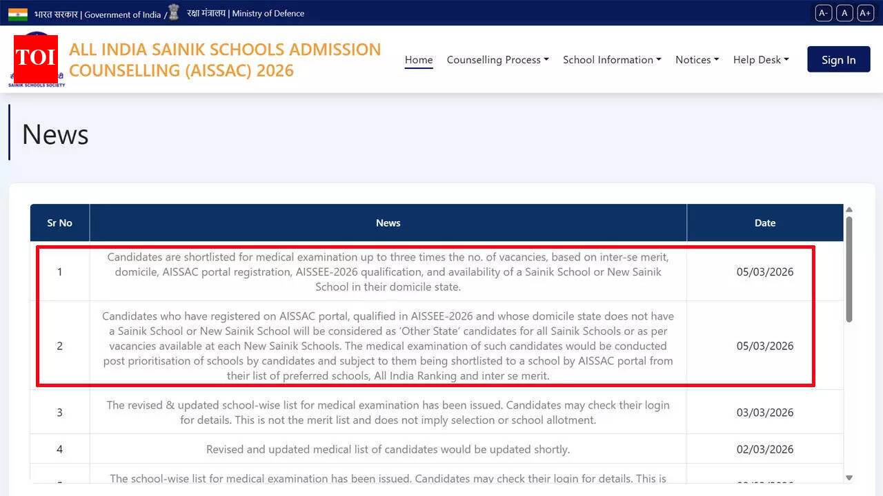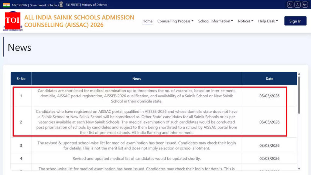 Sainik School e-counselling merit list 2026: The Sainik School Society has issued the list of candidates shortlisted for the medical examination stage under the Sainik School e-counselling process for admission through AISSEE-2026. The selection has been carried out through the AISSAC portal, which manages the counselling process for admissions across Sainik Schools and New Sainik Schools.Candidates have been shortlisted for the medical examination in a ratio of up to three times the number of vacancies available. The shortlisting has been determined on the basis of inter-se merit, domicile details, AISSAC portal registration, qualification in AISSEE-2026, and the availability of a Sainik School or New Sainik School within the candidate’s domicile state.Criteria used for shortlisting candidatesThe selection list for the medical examination stage has been prepared after considering multiple parameters related to eligibility and ranking. These include the inter-se merit position secured by candidates in the AISSEE-2026 examination and their registration status on the AISSAC counselling portal.The domicile status of applicants has also been taken into account during the shortlisting exercise. Candidates belonging to states that host Sainik Schools or New Sainik Schools are considered for institutions available within their respective domicile states, subject to vacancy positions and merit ranking.In addition, the availability of seats in the relevant institutions has been factored into the preparation of the merit list. Only candidates meeting the eligibility conditions and qualifying in AISSEE-2026 have been included for consideration at this stage of the admission process.Provision for candidates from states without Sainik SchoolsCandidates who registered on the AISSAC portal and qualified in AISSEE-2026 but whose domicile state does not have a Sainik School or New Sainik School are categorised as ‘Other State’ candidates.Such candidates are considered for admission to all Sainik Schools or to New Sainik Schools where vacancies are available. Their candidature is assessed after prioritisation of schools submitted by the applicants during the counselling process.School prioritisation and merit-based shortlistingThe medical examination for candidates in the ‘Other State’ category will be conducted only after the prioritisation of schools is completed. Applicants must indicate their preferred schools on the AISSAC portal as part of the counselling process.Following submission of preferences, the portal will shortlist candidates to specific schools based on the order of school priority provided by them, their All India Ranking, and the inter-se merit list.Candidates will proceed to the medical examination stage only if they are allotted or shortlisted for a particular school through the AISSAC system according to these parameters.