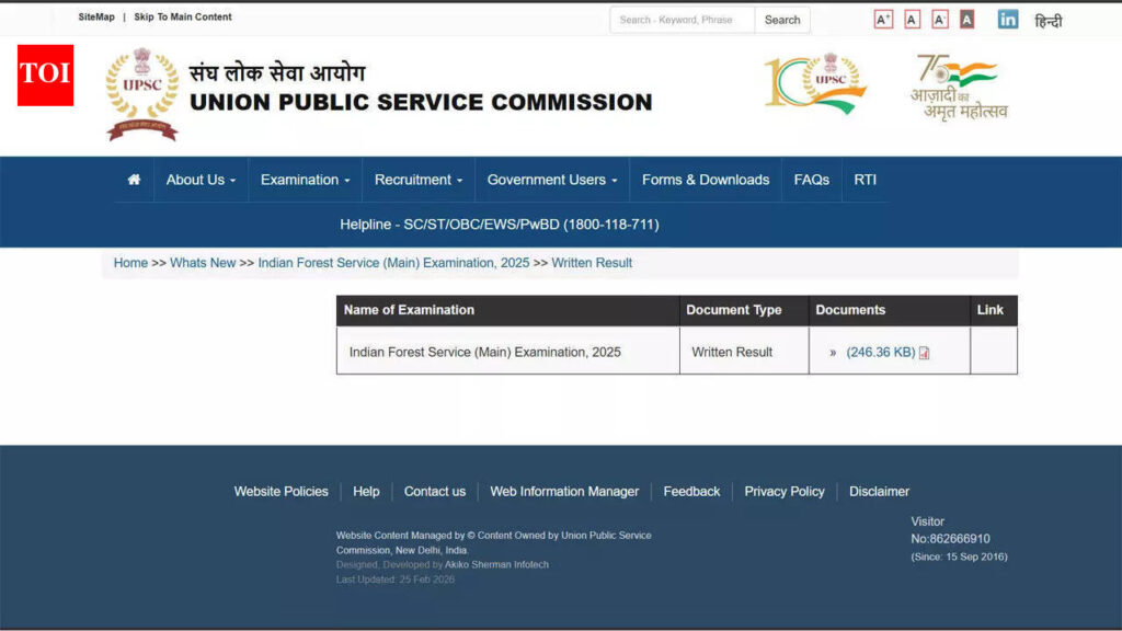 UPSC IFSE 2025 main results: The Union Public Service Commission has declared the results of the Indian Forest Service (Main) Examination, 2025, held from November 16 to November 23, 2025. Candidates whose roll numbers appear in the official list have qualified for the Personality Test (Interview) stage of the selection process.The Commission stated that the candidature of all shortlisted candidates is provisional and subject to verification of eligibility. Candidates will be required to produce original documents supporting their claims related to age, educational qualifications, community status, EWS category, PwBD status, and other applicable certificates at the time of the interview.Interview schedule and e-summon processThe Personality Tests will be conducted at the Commission’s office at Dholpur House, Shahjahan Road, New Delhi. The detailed schedule and e-Summon Letters will be released on the official websites, and candidates must download them online. No separate paper summon letters will be issued.Candidates unable to download their e-Summon Letters have been advised to contact the Commission immediately through phone, fax, or email. The Commission also clarified that requests for changes in the date and time of the interview will ordinarily not be entertained.Mandatory update of online detailsAll candidates shortlisted for the Personality Test must fill or update required fields in the Online Application Form (OAF). This includes educational qualification status along with proof of passing the qualifying examination. Failure to upload the necessary documents will result in cancellation of candidature and non-issuance of the e-Summon Letter.Where candidates are updating their details, they may also be required to update their correspondence and permanent address, higher educational qualifications, achievements, employment or service experience, previous service allocation details, marital status, parental information, previous examination attempts, OBC or EWS annexures, PwBD recommendations, and socio, economic status.Candidates who have already uploaded the required information earlier must still log in, verify the details, and submit the form to generate the e-Summon Letter.Submission window and cadre preference rulesThe Commission has provided a 15-day window from the declaration of the written result for updating mandatory details and uploading proof of qualification. Candidates will be able to use the online submission facility from 27.02.2026 till 13.03.2026, 6:00 PM only. No appeal will be considered after the expiry of this period for submission of information by candidates.Besides updating the personal information, the window will also be open for candidates to change their cadre preferences and related details. No request for change in cadre preference shall be entertained after submission. Cadre allocation shall be done as per the policy prevailing at the time of allotment, giving due consideration to the preferences of candidates.Additional provisions and result statusFurthermore, after the submission of the necessary information, a reference number unique to the candidate will be sent to his/her email or mobile via SMS. In case of any change in the address or contact details, it must be intimated within seven days of the issue of the press note through the approved channels.The Commission will upload mark sheets of all candidates within 15 days after publication of the final result following the interviews, and these will remain available for 30 days. The result of one petitioner candidate has been kept in a sealed cover in compliance with an interim order of the Gujarat High Court in SCA No. 12450/2025.